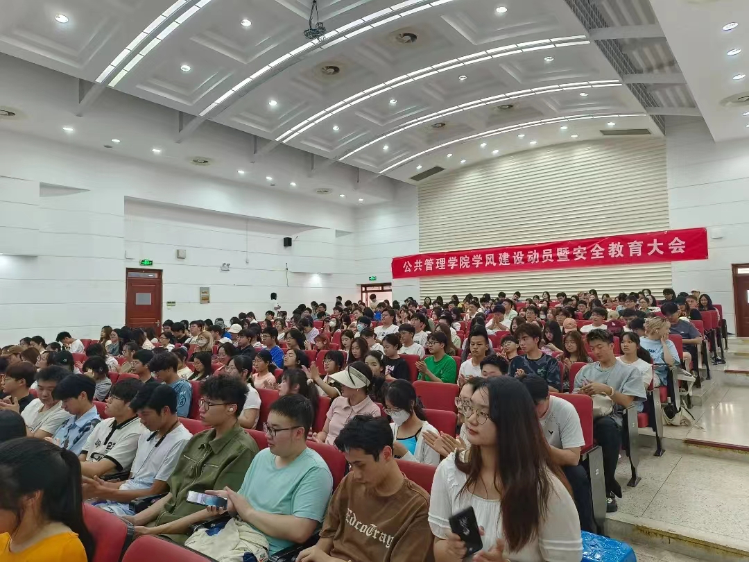 于德经楼报告厅召开了2023年学风建设暨暑期实践动员大会。出席本次会议的嘉宾有:院党委书记高晓东、院长黄建伟、院党委副书记孙启、副院长唐润、副院长汪栋、院长助理张丽芳、院公共事业管理系主任詹国辉、院房地产开发与管理系主任朱高立。全体辅导员、院20级、21级、22级本科生、研究生、MPA学生(线上)参加会议,会议由院学工办主任尹杰主持。