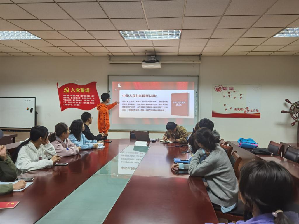 宣传活动伊始,由主持人为大家科普法律知识,以此来树立学生们的法律意识。以《中华人民共和国民法典》为例,主持人详细地为大家解释着其涵盖的内容以及适用范围,同学们个个听得聚精会神并做了笔记。在此基础上,主持人又为大家进行案例分析,使学生们的感触更加真实与深刻。