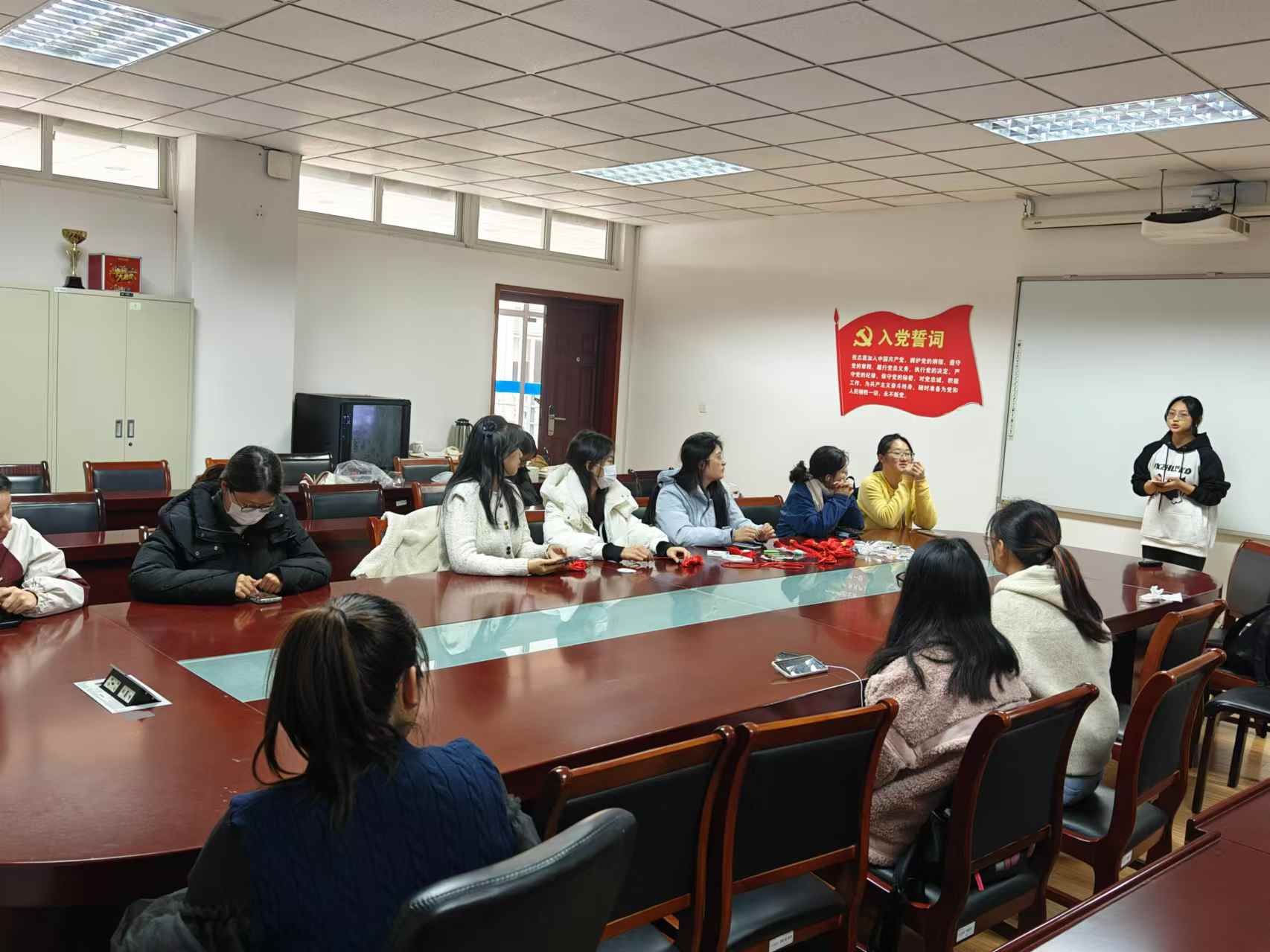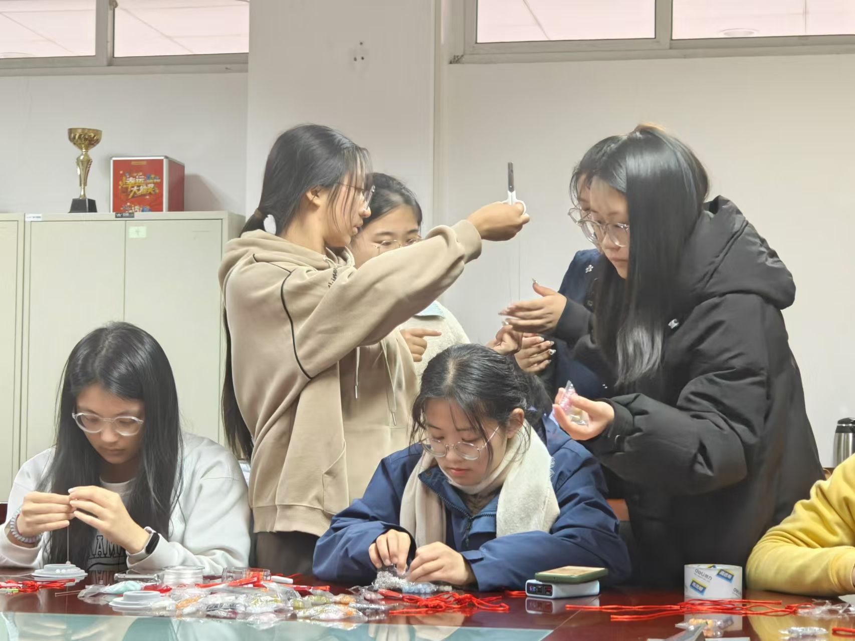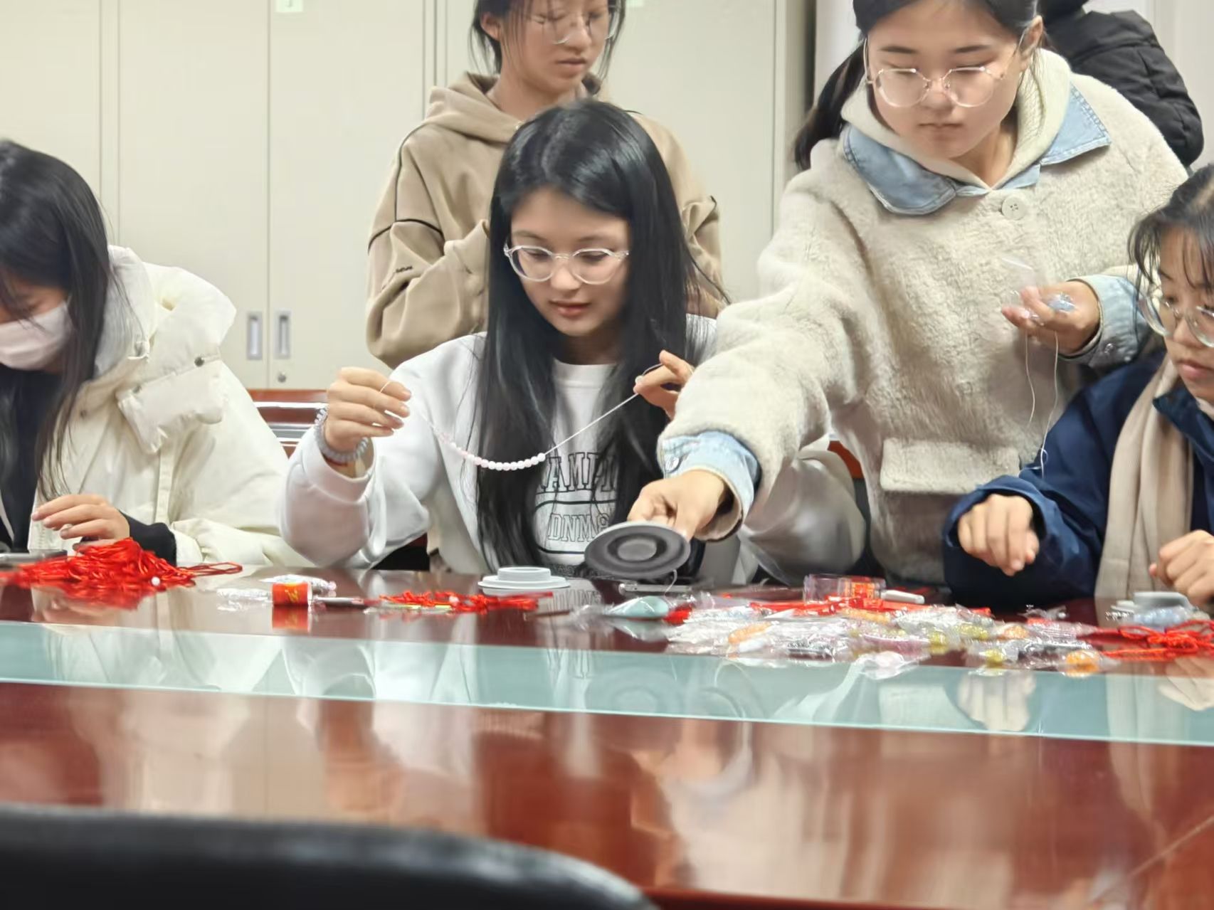 活动开场,主持人详细介绍背景与内容后发放原材料和工具,并引导同学们观看手工艺品制作视频。同学们专注于编织,一根细绳、几颗彩珠在手中穿梭,编织出精美作品,也编织出传统手工艺的悠长历史。中国结文化源远流长,从结绳记事发展而来,历经岁月成为福瑞象征,其精美的东方韵味在同学们的努力下得以重现。同学们熟练运用绾、结、穿、绕等技巧,桌上摆满了一个个精美的中国结,不少同学还兴致勃勃地开始制作第二个。