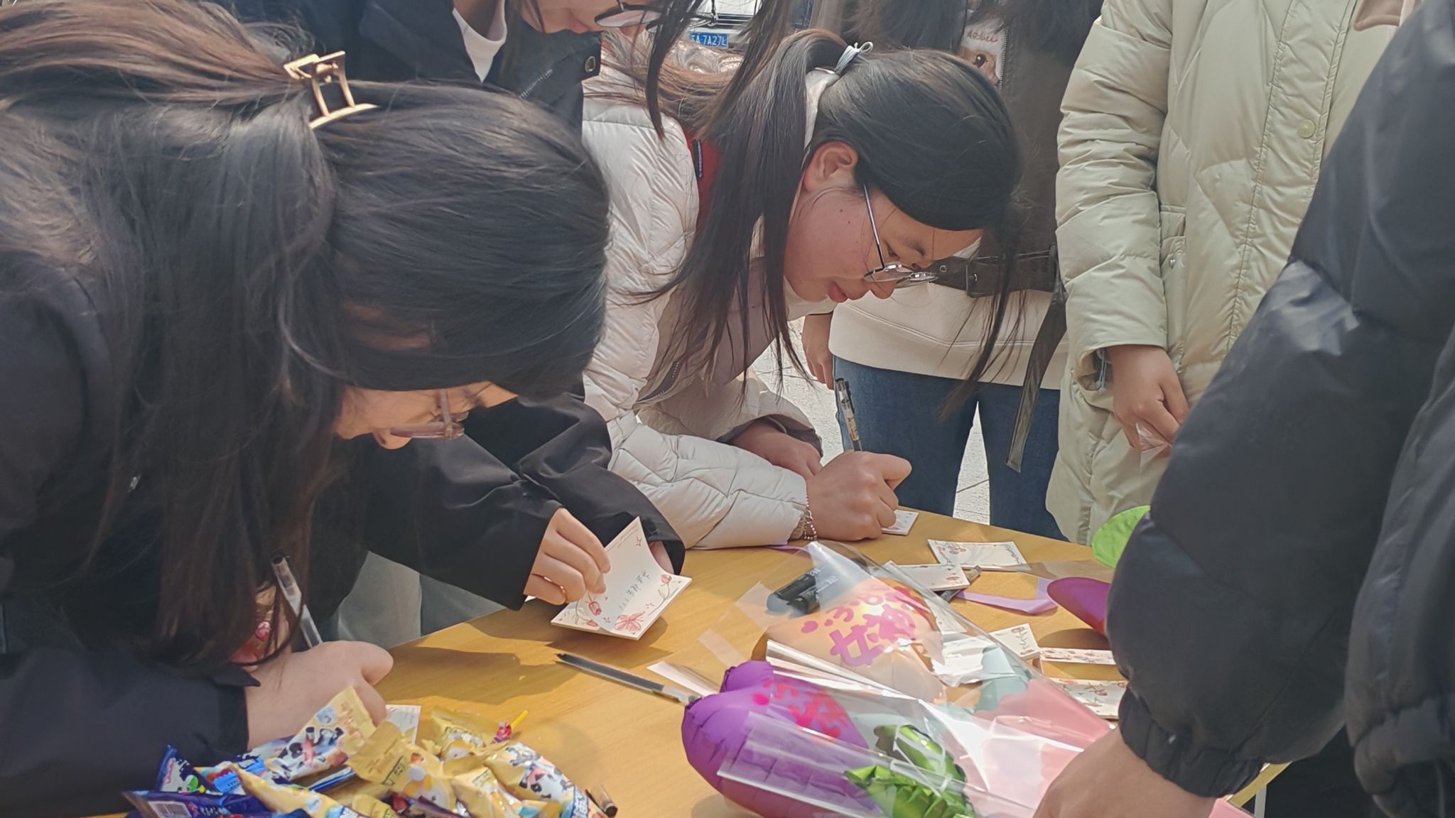 在中苑食堂门口搭建起一方治愈空间,来往的师生在展板上留下了温情的对话。展板上贴满了海报,海报上充斥着来自四面八方的声音:“情绪化”“家庭主妇”“必须温柔”……这些贴在女性身上的刻板标签,被一张张撕下。取而代之的,是五彩斑斓的祝福与礼赞,师生们驻足提笔,写下了对女性的肯定和期许:”你们勇敢且坚定”、“祝她铮铮,祝她昂扬”、“希望每一位女性健康快乐,成为任何想成为的人”……标签不该定义女性,彩色的便利贴如蝶翼栖满墙面,每一句留言都是对偏见的打破,对多元价值的拥抱。