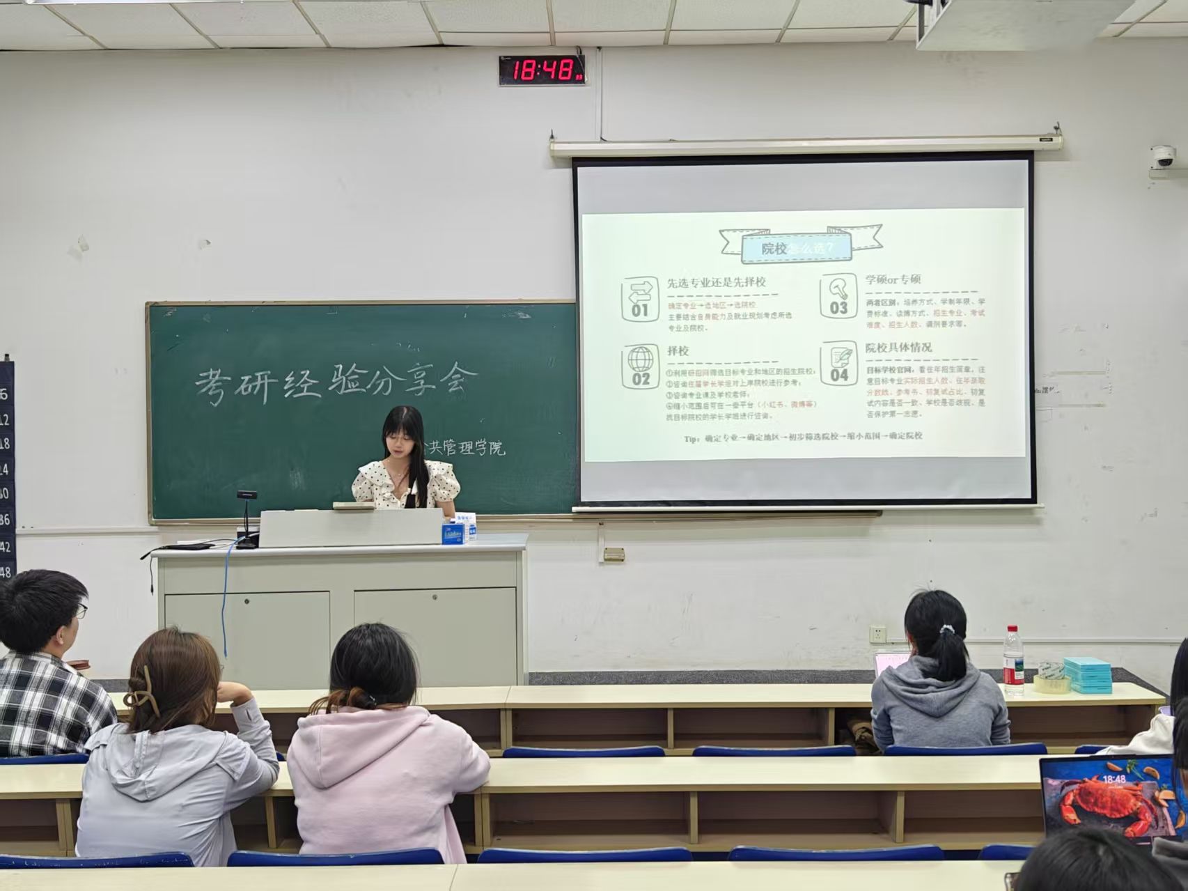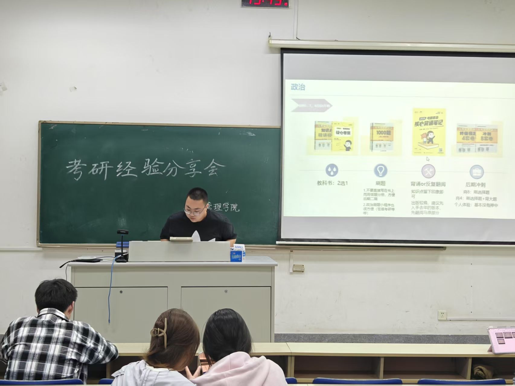 学生会在德济楼102教室举办了“筑梦沿途,经验领航”考研经验分享会。本次邀请到4位分别上岸中国人民大学、中国科学院大学、华中农业大学、厦门大学的优秀学长学姐,为同学们带来实用备考经验与暖心建议。