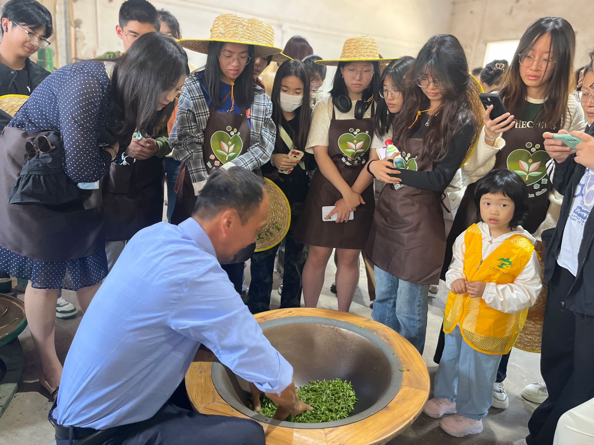 采茶结束后,大家来到制茶场地,亲身体验杀青环节。无论是机制杀青展现的现代劳动智慧,还是手工杀青蕴含的传统匠心技艺,都让师生们与孩子们深深体会到制茶的复杂。孩子们睁大眼睛,好奇地观察着每一个步骤,在实践中直观地感受到劳动的不易;大学生们也从主任的讲解和亲身体验炒茶过程中,进一步深化了自己对劳动价值的认知。这一过程,不仅是技能的学习,更是“劳动建心”理念的生动实践,让大家在体验中感悟到劳动对塑造坚韧品格、培养耐心与专注力的重要作用。