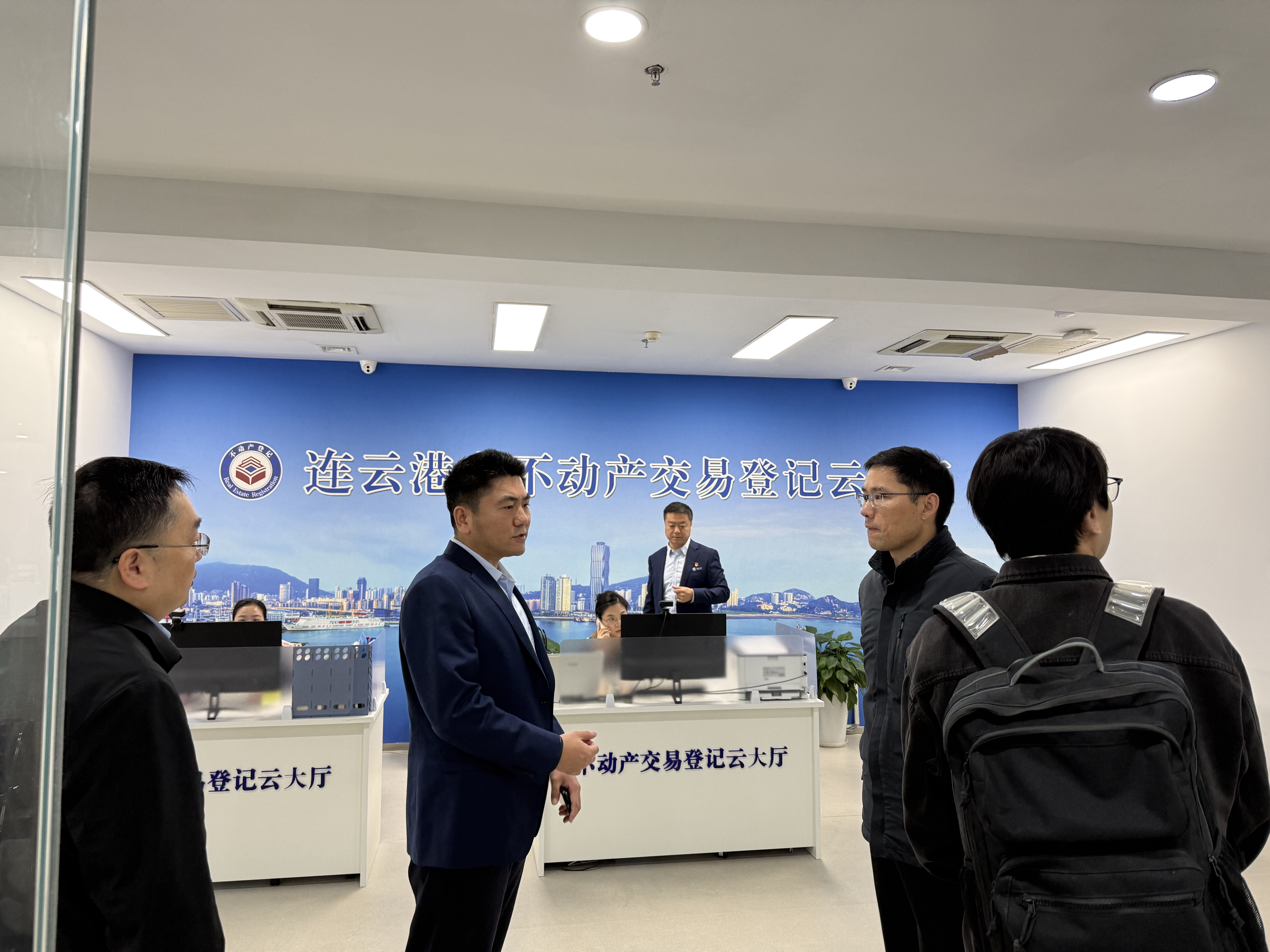座谈会结束后,在连云港市数据局相关负责人的带领下,调研组实地参观了连云港市不动产交易登记中心,深入了解人工智能技术在政务服务一线的实际应用情况。目前,该中心已将线上审核业务接入DeepSeek大模型,构建起“AI预审+人工确认”的智能协同工作模式。同时,依托云端平台推行随机分区审核机制,将业务自动派发至非办事人所属行政区的审核人员系统中,有效规避人为干预,进一步提升审批过程的公平性、透明度与效率。