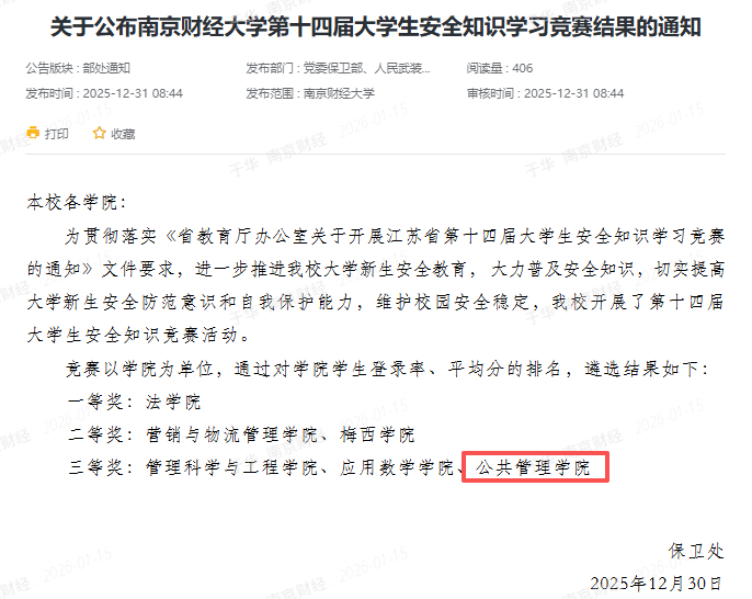 通过参与此次竞赛,不仅提升了同学们的安全防范意识,也为构建平安校园贡献了力量。学院将以此次获奖为契机,继续加强安全教育工作,切实提升学生安全防范意识与自我保护能力,为平安校园建设贡献更多公管力量。