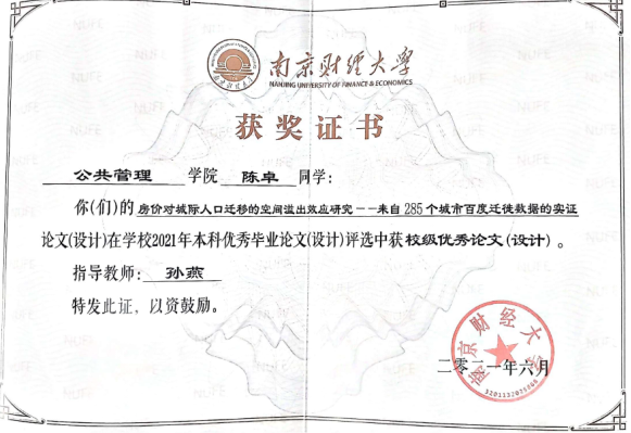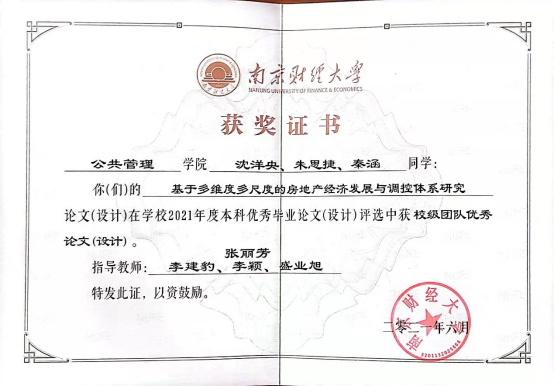 2017级房地产开发与管理专业学生陈卓的毕业论文“房价对城际人口迁移的空间溢出效应研究——来自285个城市百度迁徙数据的实证”(指导老师:孙燕)在韩国漫画 2021年度本科优秀毕业论文评选中获得校级优秀论文;沈洋央、朱思捷、秦涵等同学的论文“基于多维度多尺度的房地产经济发展与调控体系研究”(指导老师:张丽芳、李建豹、李颖、盛业旭)获校级团队优秀论文。