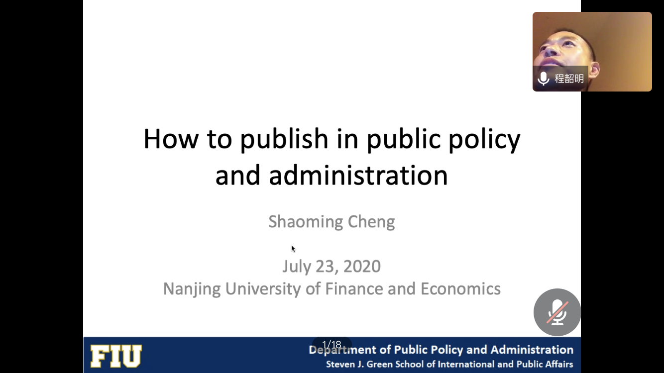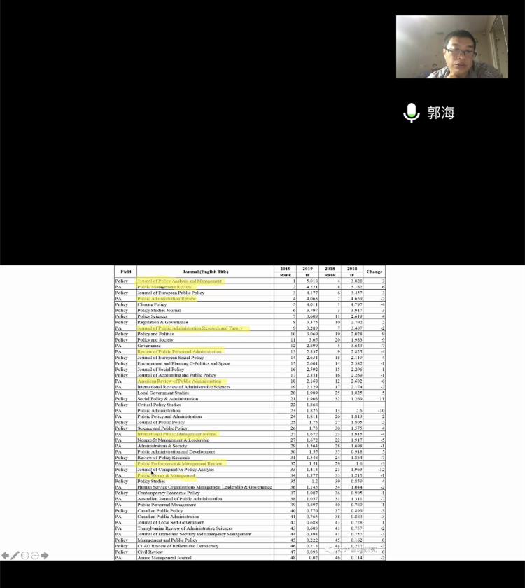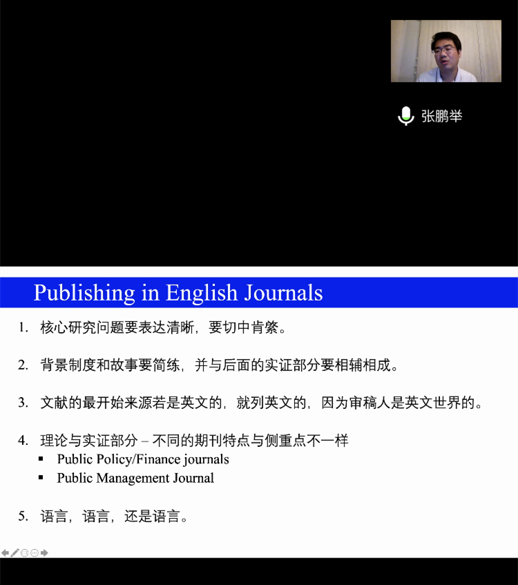 郭海副教授和张鹏举助理教授共同作了题为“Publishing in PA journals”的学术报告。两位学者首先简要介绍了英文公共行政类期刊的总体发展趋势及部分核心期刊的文章类型。随后,他们深入浅出地分析了中文学者写作英文论文时容易出现的误区,并提供了具有针对性的解决方法。两位学者提出写作时要强化读者意识,写作语言要朴实易懂,突出重要的逻辑链条,严格遵循学术论文结构规范。此外,他们还建议教师们要将审稿机会视为宝贵的成长经历,提前了解英文期刊投稿和审稿的相关规则,从而提高成功率。