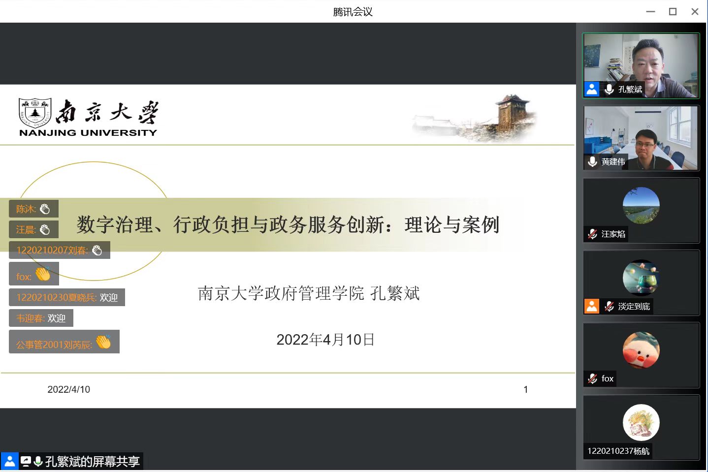 孔繁斌教授从“理解政务服务:推进高绩效的履职”、“政务服务中数字治理的机理与机制”、“优化行政负担:政务服务创新的价值意涵”、“案例分享”、“以智能政策产品优化政务服务绩效”等五个方面展开详细讲解。孔繁斌教授以威尔逊在《行政之研究》中提出的“政府能够适当和成功地做什么,以及怎样高效率和低成本地去做”这一行政学原初问题切入主题,提出政务服务创新路径的基本命题,并结合理论与现实对政务服务创新的内涵、面临的挑战、发展趋势作了详细介绍。孔繁斌教授重点围绕“数字治理对政务服务创新和优化行政负担”进行了前瞻性分析,提出了基于信息交互和界面重构的政务服务创新分析框架,并结合最新案例作了详细讲解。最后,孔繁斌教授以自己对政务服务创新的理解经历,鼓励青年师生既要加强公共管理基础理论研究,也要关注公共管理实践的最新发展,实现理论与实践双向层面的知识再生产。