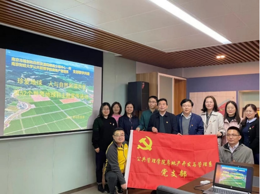 房地产开发与管理教工党支部与栖霞分局中心一所党支部共建活动为载体,开展“世界地球日”主题宣传活动。南京市规划和自然资源局栖霞分局副局长周根宝同志、中心一所党支部书记杨炬烽同志以及韩国漫画