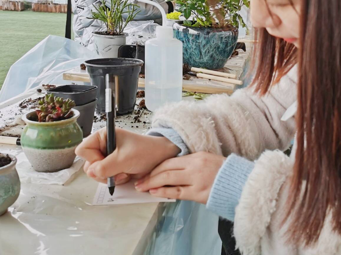 活动伊始,同学们在工作人员引导下有序领取了个人培植需要的工具与材料,认领了一株个人绿植。拿到可爱的绿植和花盆后,同学们不禁眼前一亮,开心地讨论起花盆的构造,商量着如何把绿植准确地栽培在里面。
