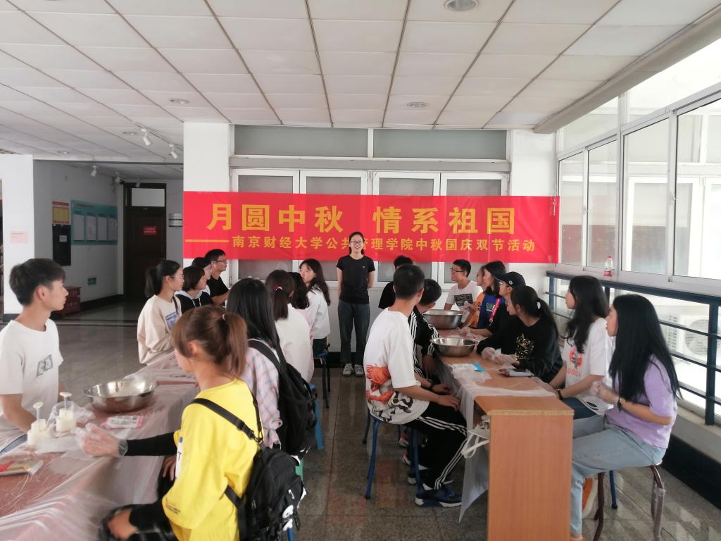 学生会成员提前准备好了制作月饼的原料,在活动现场自己动手制作寄托着自己心意的月饼,大一新生制作了印有“自谦”“自信”“务实”“超越”字样的月饼,虽然初入校园,但时刻铭记着校训,始终保持自谦自信的品质,务实超越的态度。学院党委副书记张荣霞老师特意制作了“大爱公管”月饼,她说:“公管院要一直秉持‘大爱’的精神,要爱国爱校爱家。”