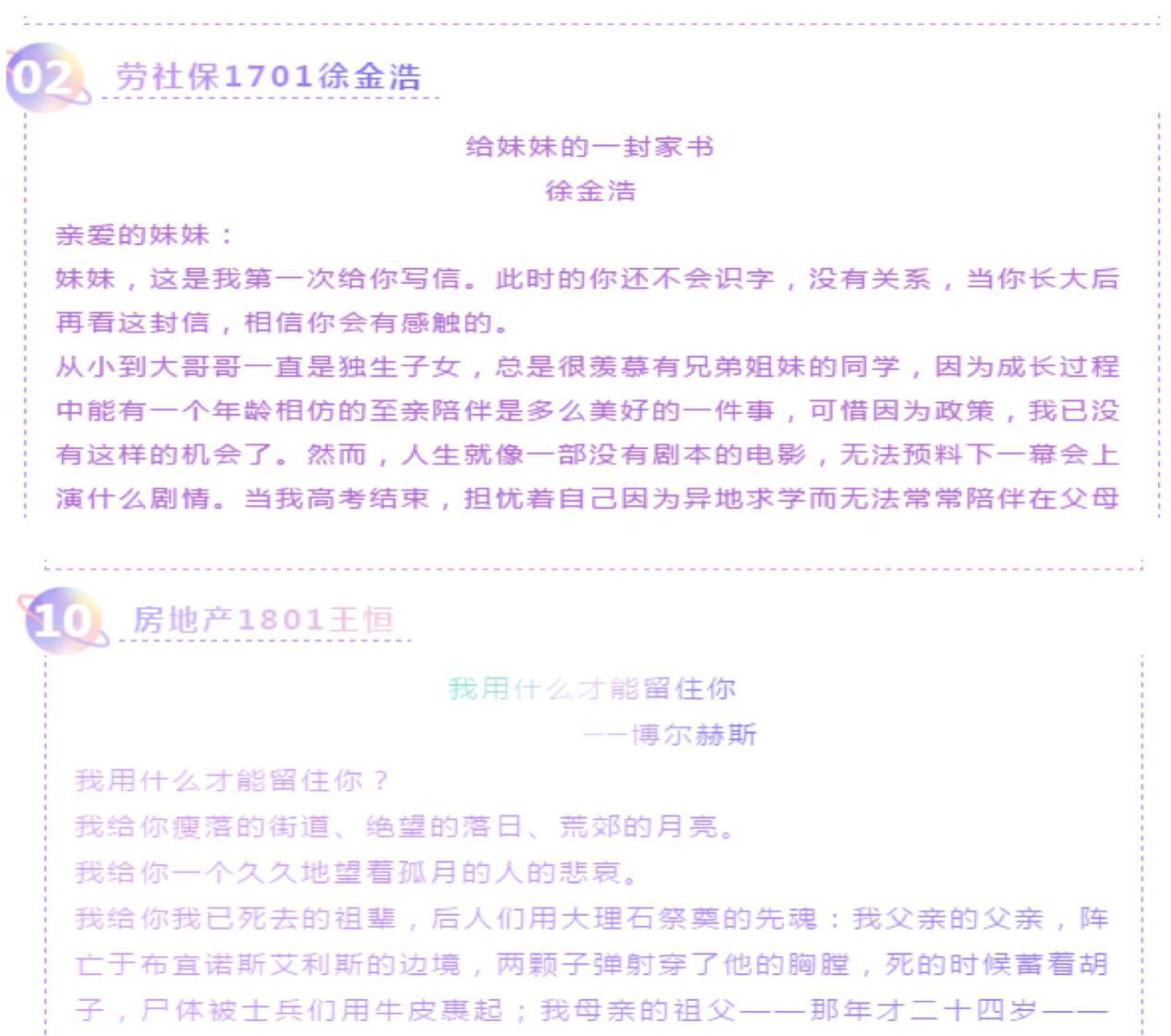 昀兮心理为此组织展开了“光音暖暖,与你有信”线上三分钟“朗读者”大赛。活动当中,有的同学为自己可爱的妹妹书写并朗诵了一封真挚而温馨的家书,也有同学朗诵了自己珍藏的短诗,每一份投稿都饱含着同学们内心的温柔和感动,同时同学们也通过朗诵的作品将声音和文字的力量融合,来治愈自己鼓励他人,将心中的情绪释放,将内心的爱意表达,让同学们能够以乐观积极的心态面对学习和生活。