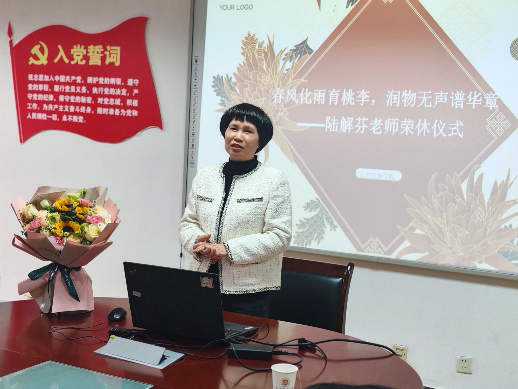 在仙林校区德济楼508会议室隆重举行了陆解芬老师的荣休仪式。学院全体领导班子成员、系主任、支部书记以及多位教师和学生代表出席,共同见证了这一重要时刻。荣休仪式由院党委书记高晓东主持。